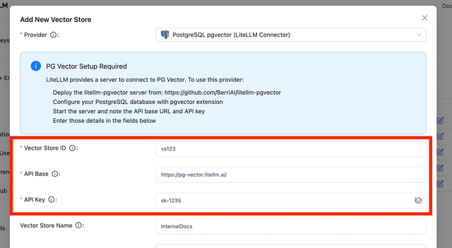- Follow the deployment instructions for the litellm-pg-vector-store connector here